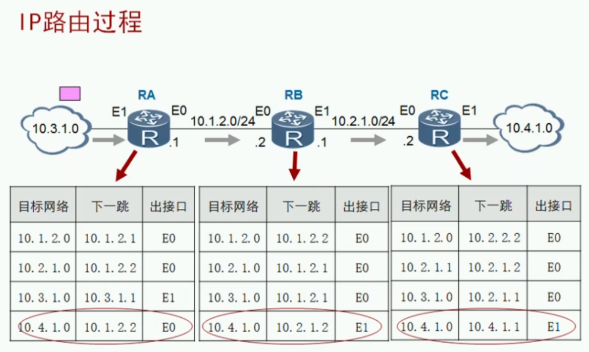 到达RC后,RC同样查找路由表,发现去往10.4.1.0网络需要经过10.4.1.1;而到10.4.1.1网络的接口为自己的E1接口,因此将数据包从指定的路由表中转发