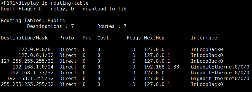 <>display ip routing-table #查看路由表