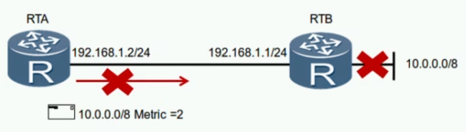 这时候RA只能收来自RB的告知,但RA绝对不能再告诉RB:到达10.0.0.0/8网络需要2跳