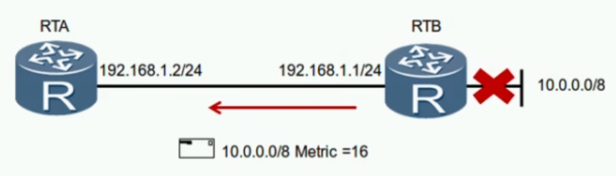 例如:当RB发现10.0.0.0/8接口挂了,将立刻告知RA:到达10.0.0.0/8网络需要16跳