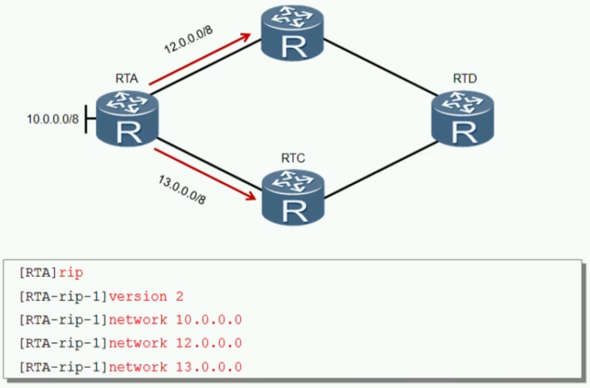 [rip]network xx.xx.xx.xx #宣告地址(即指定运行RIP的接口,只需要输入接口的主类网络地址即可,只有处于此网络中的接口,才能进行RIP报文的收发)