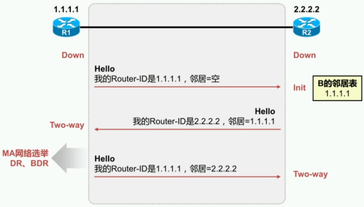 - 例:R1发送了一个Hello包,R2收到了,于是R2认识了R1 后续R2也会发送一个Hello包 表明自己认识R1;R1收到后,与R2就会处于Two-Way状态