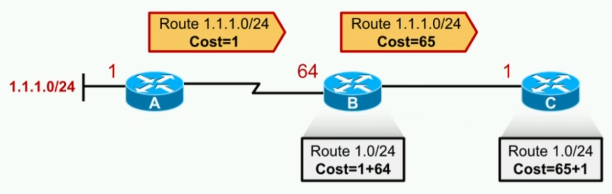 到一个目标网络的度量值=从源到目标所有出站接口的Cost值累加(数据方向);或者说:到一个目标网络的度量值=从源到本路由器沿途所有入站接口的Cost值累加(路由方向) 如图所示