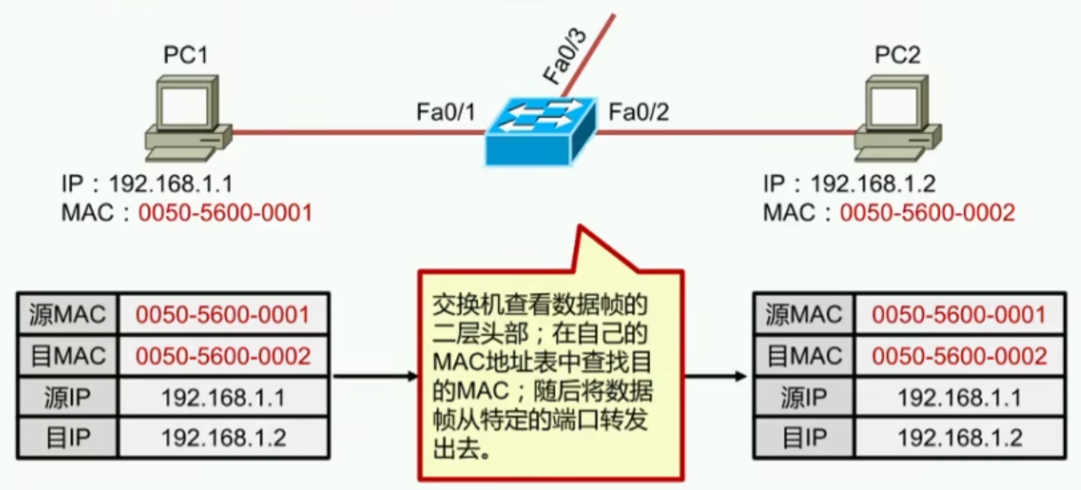 交换机工作在数据链路层,对数据帧进行操作。在收到数据帧后,交换机会根据数据帧的头部信息对数据帧进行转发。