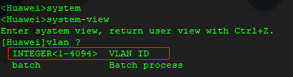 <>system-view []vlan 10 #创建一个Vlan 编号为10 []vlan batch 10 to 20 #创建多个Vlan 编号为:10~20 []dislpay vlan #查看Vlan信息
