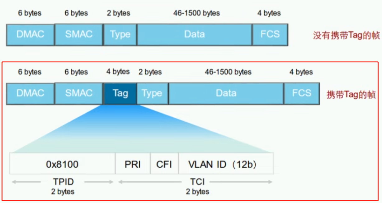 - 干道链路上传输的帧几乎都是tagged帧;由此用于两端识别