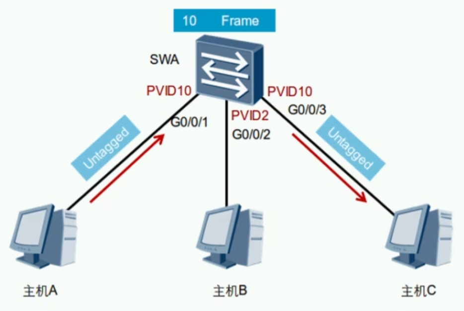主机A发送的信息是不带标签的,传到交换机时,交换机会发现此信息从PVID10接口进来,因此打上Tag10标签