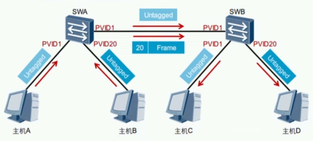 比如:交换机A发现允许列表中有PVID10 但接口是PVID20 那么交换机A直接转发给交换机B,这样交换机B才能得知交换机A发过来的帧是属于PVID20