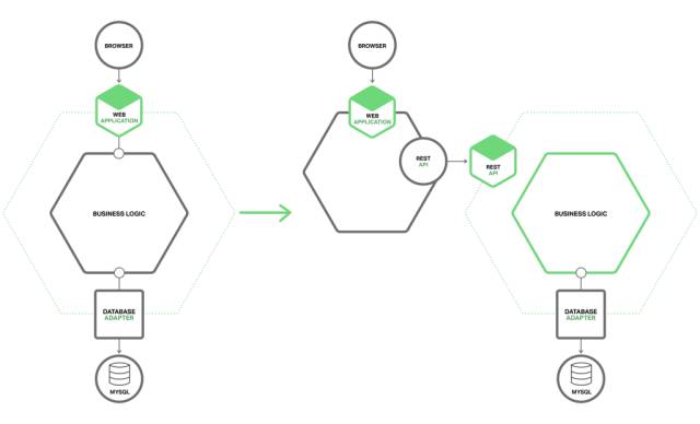 一旦你实现了细粒度的接口,就可以将模块改造为一个独立的服务。要写代码实现单体和微服务间的通信,通过使用了IPC机制的API。下图展现了一个架构在改造前,改造中和改造后的样子: