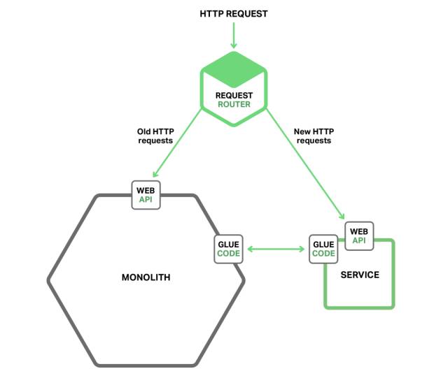 另一个组件是胶水代码(glue code),用来将服务与单体应用集成起来。一个服务很少是隔离存在的,需要访问单体应用的数据。胶水代码就负责这些数据集成。微服务组件可以通过它来读写单体应用中的数据。