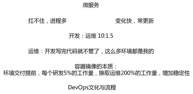不是微服务,根本不需要容器,虚拟机就能搞定,不需要DevOps,一年部署一次,开发和运维沟通再慢都能搞定。