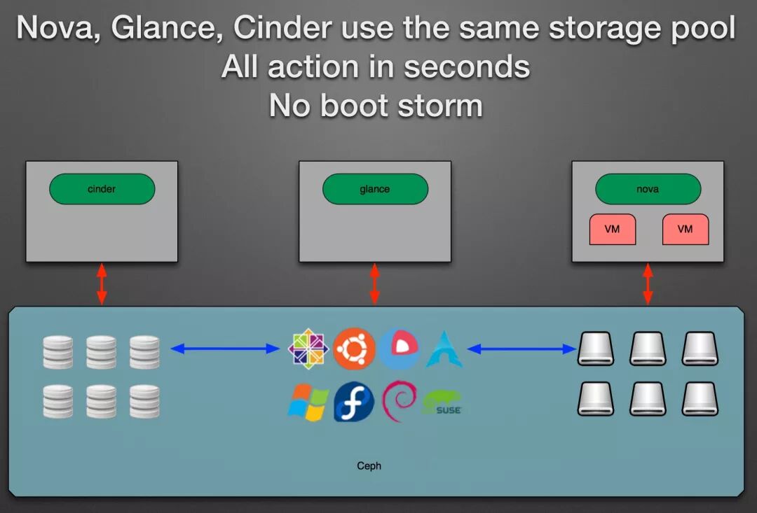 现在OpenStack中的VM的启动速度也优化的越来越快了,启动一个VM的时候,原来需要从Glance下载虚拟机镜像,后来有了一个技术,是的Glance和系统盘共享Ceph存储的情况下,虚拟机镜像无需下载,启动速度就快很多。