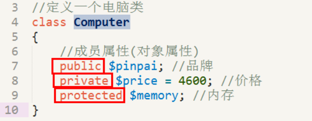 - 类中定义的变量,就是类的成员属性,但是成员属性一定要带权限修饰符,普通变量不需要