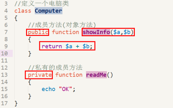 - 成员方法和函数区别在于,成员方法只能存在类中,并且可以添加访问权限修饰符,也可以省略,默认为public