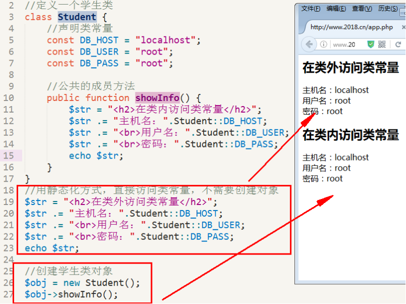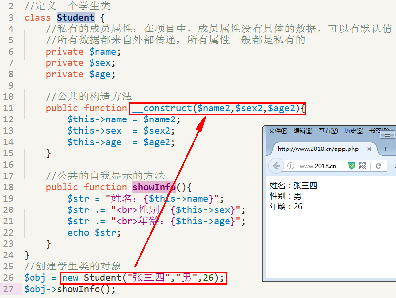 <?php class Student { public $name="呃呃呃"; public function showInfo($a,$b) { return $a + $b; } } $obj=new Student; //读取属性 echo "我的名字:{$obj->name}"."<br>"; //调用方法 $c=$obj->showInfo(5,6); echo $c; ?>
