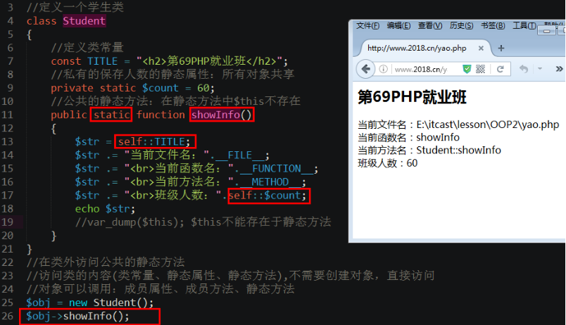 - self用来调用类常量,静态属性,静态方法