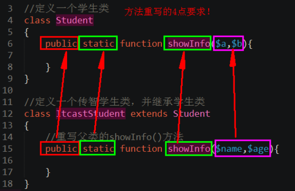 - 多态性 主要指方法重载和方法重写, php只支持方法重写(要与父类的方法名,形参个数,方法类型一致和不低于父类的访问权限)