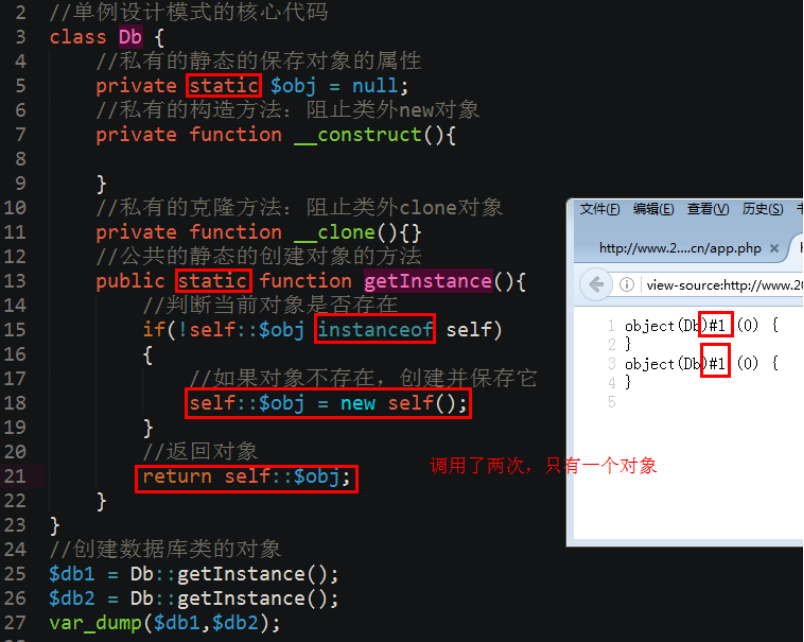 <?php //单例设计模式的核心代码 class Db { //私有的静态的保存对象属性 private static $obj=NULL; //私有的构造方法,防止类外new对象 private function __construct(){ } //私有的克隆方法,防止类外clone对象 private function __clone(){ } //公有的静态的创建对象的方法 public static function getInstance(){ //判断当前对象是否存在 if(!self::$obj instanceof self) { //如果对象 不存在,创建并保存他 self::$obj=new self(); } // 返回对象 return self::$obj; } } //创建数据库类的对象 $obj1=Db::getInstance(); $obj2=Db::getInstance(); var_dump($obj1,$obj2); ?>