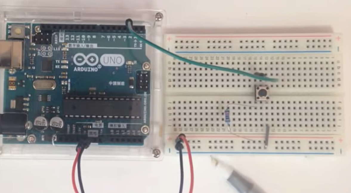 3)按键开关控制电路元件:按键开关、10K欧姆电阻(作上拉电阻)、4根导线(3长1短)、面包板、Arduino UNO开发板。完成后可用串口工具打印调试。