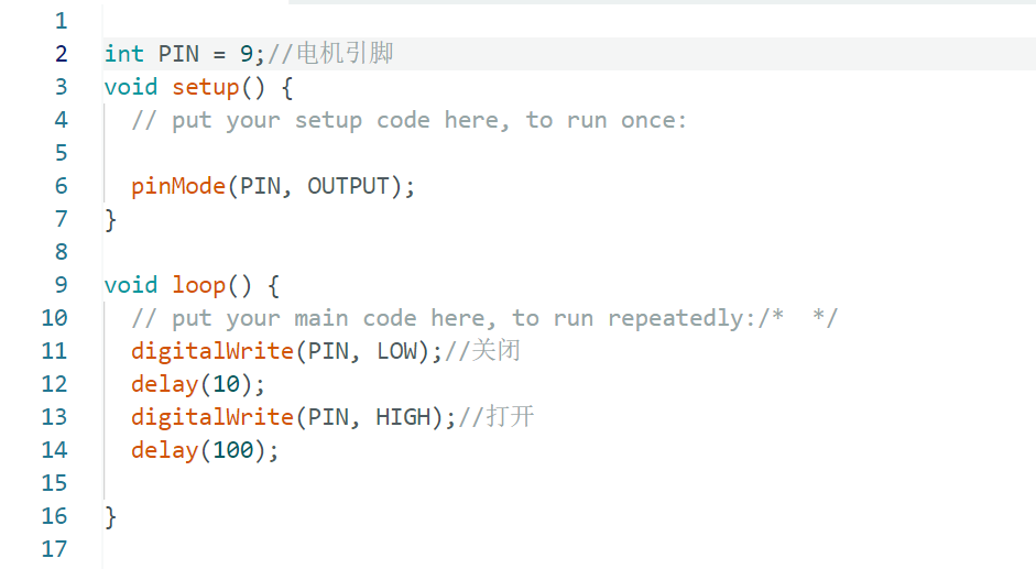 // 定义引脚号 const int ledPin = 13; void setup() { // 将ledPin设置为输出模式 pinMode(ledPin, OUTPUT); } void loop() { // 点亮LED digitalWrite(ledPin, HIGH); delay(1000); // 延迟1秒 // 关闭LED digitalWrite(ledPin, LOW); delay(1000); // 延迟1秒 }
