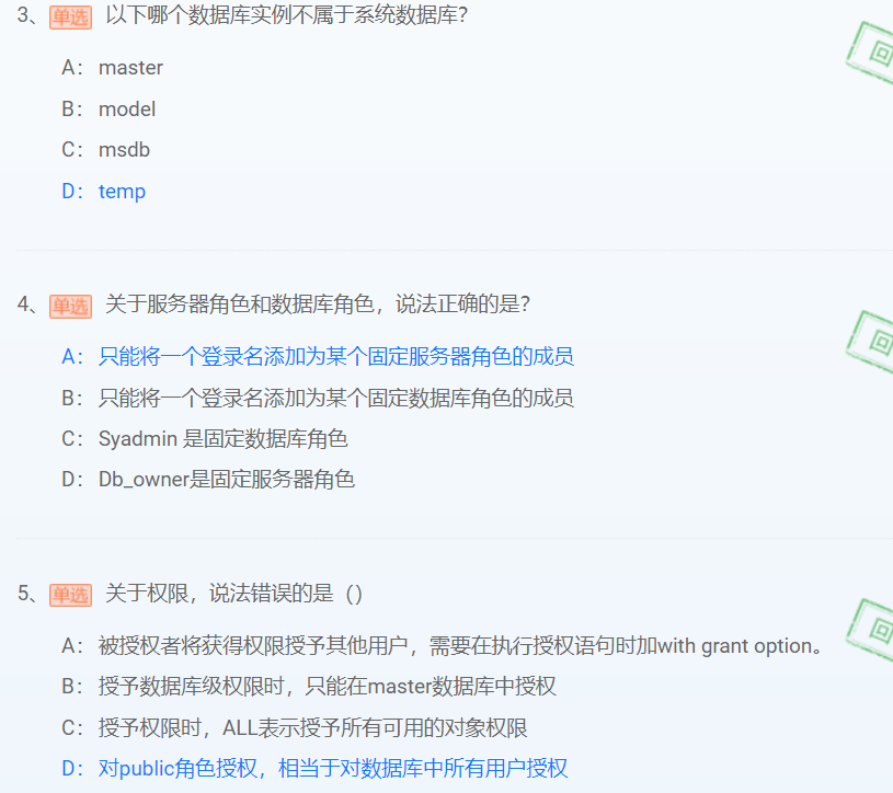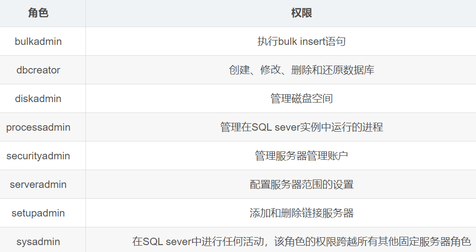 - 固定服务器角色:固定服务器角色是在服务器层次上定义的,它们位于从属于数据库服务器的数据库外面。包括bulkadmin、dbcreator、diskadmin、processadmin、securityadmin、serveradmin、setupadmin、sysadmin