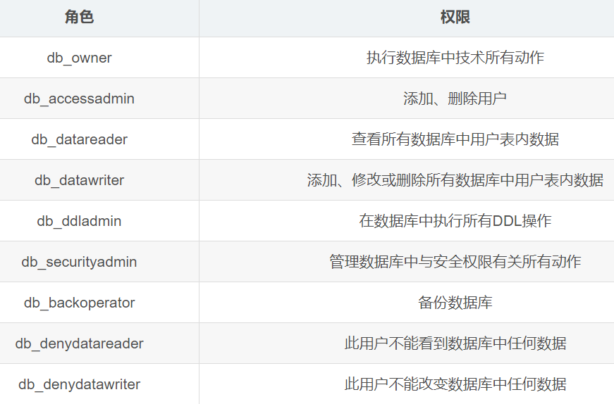 固定数据库角色:固定数据库角色在数据库层上进行定义,它们存在于属于数据库服务器的每个数据库中。包括db_owner、db_accessadmin、db_datareader、db_datawriter、db_ddladmin、db_securityadmin、db_backoperator、db_denydatareader、db_denydatawriter。
