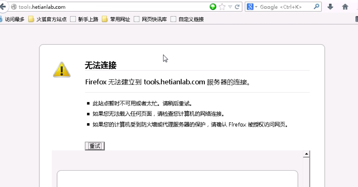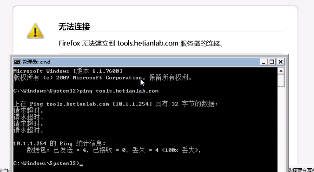 打开浏览器,此时已经无法访问http://tools.hetianlab.com。但可ping通。截图中返回了IP地址说明是通的,请求超时只是网站为了安全而设置的禁ping策略。