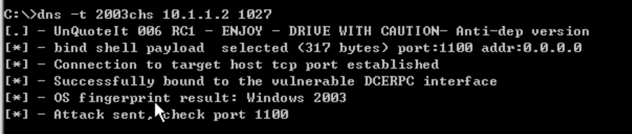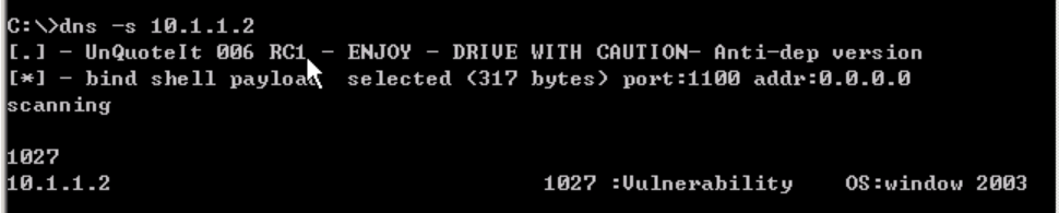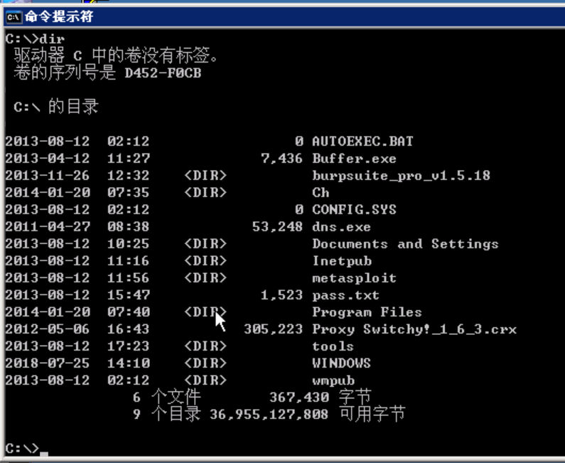 在cmd下切换到C:\目录下,查看该目录下的文件,可以看到有个文件dns.exe,这个文件即是我们本次实验的溢出工具