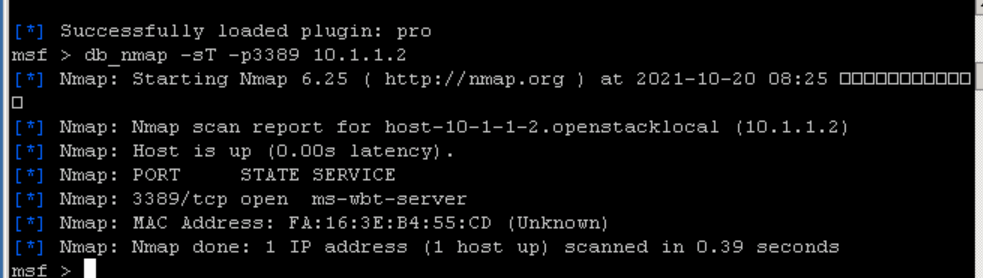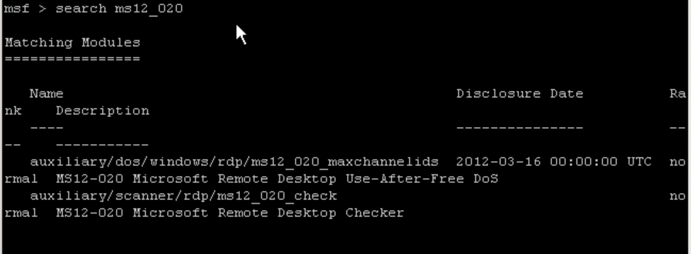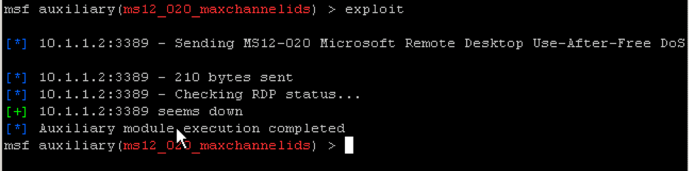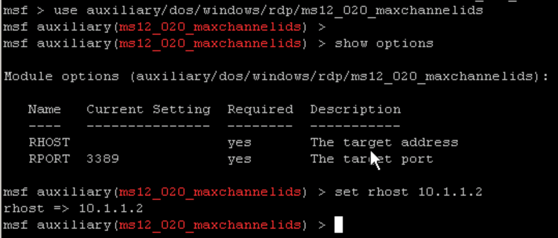 输入use auxiliary/dos/windows/rdp/ms12_020_maxchannelids命令,并设置相关的参数