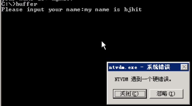 在提示符下输入buffer运行程序,输入bjhit,发现程序正常运行