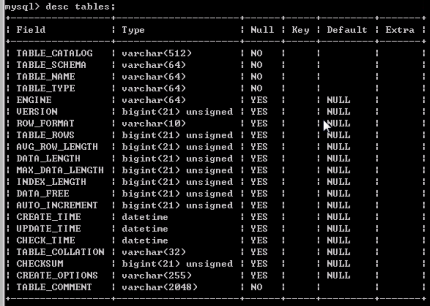 desc 可以用来看表结构。看下tables的表结构,执行desc tables;