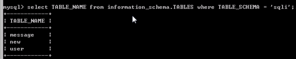 可以看到,最后一条记录的TABLE_NAME是user,TABLE_SCHEMA为sqli。查看sqli数据库中的表,SQL语句为:show tables from sqli;可以看到确实存在user表