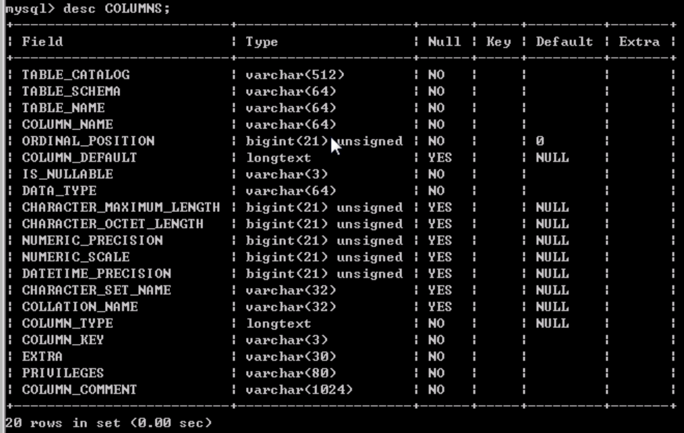 在information_schema数据库中,同样存在一个表,它保存了整个数据中,所有的列名,这个表就是COLUMNS.同样先查看该表结构。