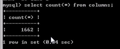 与注入相关的存在3个字段,分别是TABLE_SCHEMA、TABLE_NAME以及COLUMN_NAME,不难猜到,如果在该表中查询一条记录,TABLE_SCHEMA保存了这条记录保存的字段所属的数据库名,而TABLE_NAME保存的是该字段所属表名,COLUMN_NAME则是一个列名记录,查询一条记录验证一下,首先确定该表有多少条记录,执行select count(*) from columns;,得知一共有1662条记录