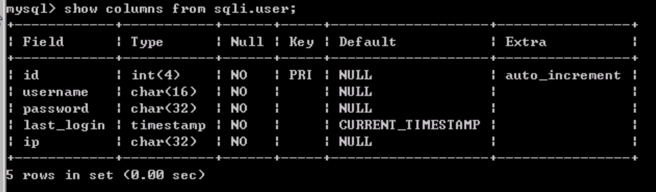 查看sqli的user表是否存在该字段,执行SQL语句:show columns from sqli.user;