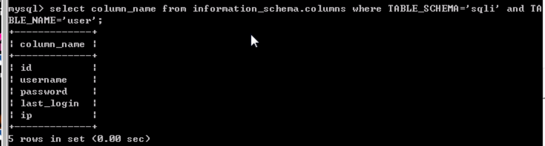 select column_name from information_schema.columns where TABLE_SCHEMA='sqli' and TABLE_NAME='user';