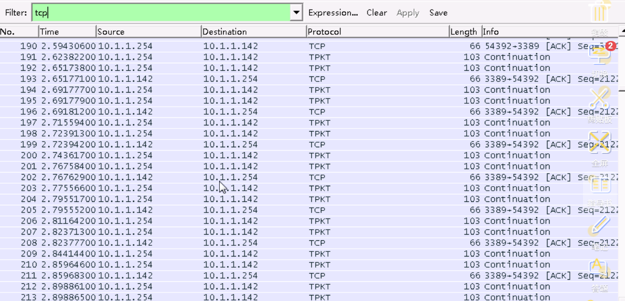 获取的TCP协议的数据包。分为两部分,即TCP三次握手,四次断开的数据。但在实际的操作中,可能遇到的情况较多,比如源IP和目的IP比较多,协议的帧号乱序等各种问题。在此,我们教大家简单的过滤功能,着色功能方便过滤和查看。 启动Wireshark,在Filter中输入tcp,点击Apply会看到很多的数据包,这是因为测试环境中,有很多的应用程序,与其服务器连接,使用TCP协议