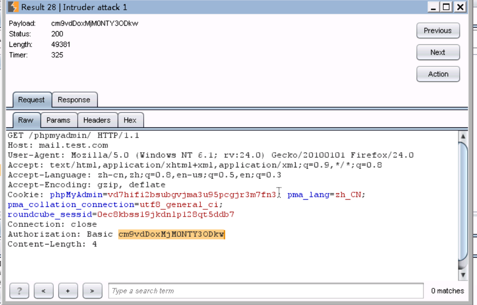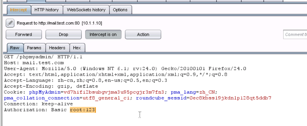 5、接下来对phpmyadmin进行暴力破解,随便输入一个用户名和密码,比如此处我输入:用户名:root 密码:123,页面提示错误,然后查看burpsuite截获到的数据包