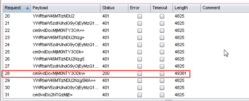 14、单击intruder下的start attack,一段时间后,发现了一个length和其他的不同