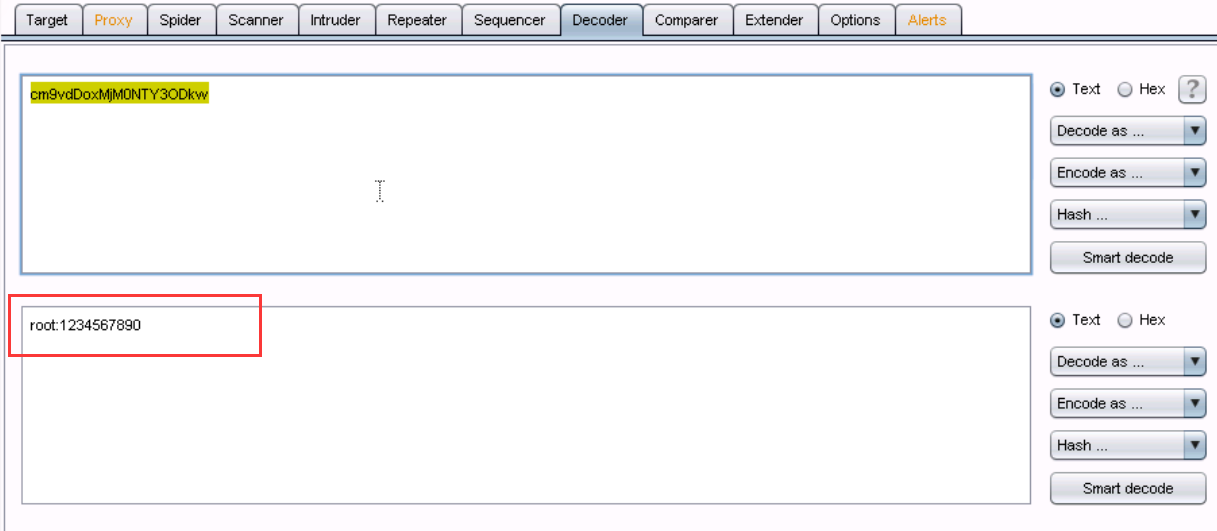 16、粘贴在decoder下,选择decode as base64,可以看到用户名密码为root:1234567890,登录