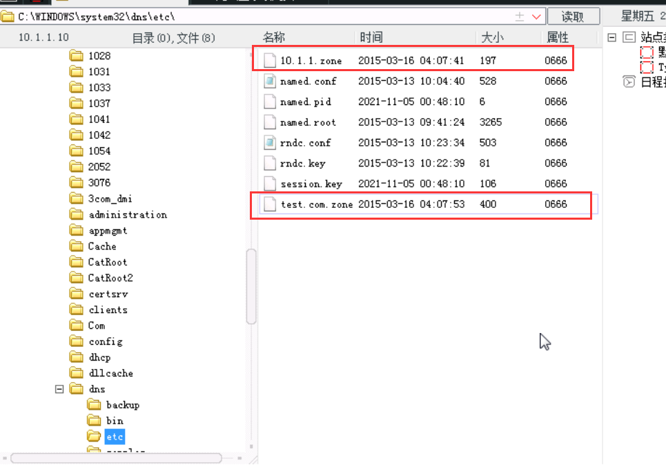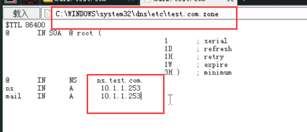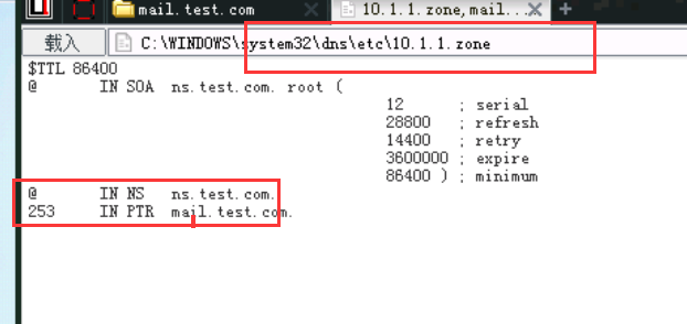 21、接下来我们需要对这台服务器进行域名劫持,将其劫持到一台IP为10.1.1.253的主机上,找到C:\WINDOWS\system32\dns\etc中的test.com.zone和10.1.1.zone