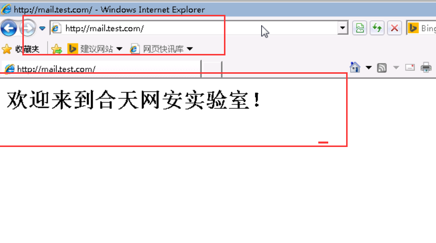 25、刷新 http://mail.test.com,发现劫持成功。页面会显示为:“欢迎来到合天网安实验室!