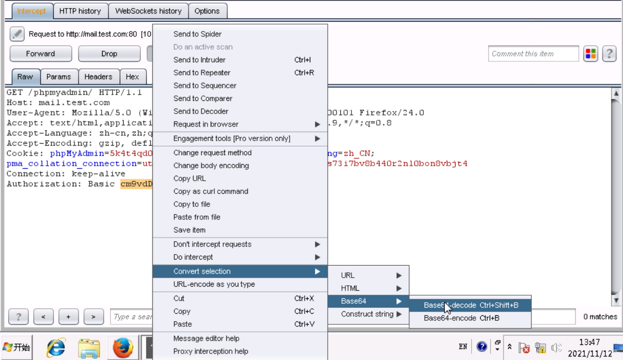 6、找到Authorization,选中Basic后边的字符串,进行如下步骤:右键convert selection->base64->base64-decode