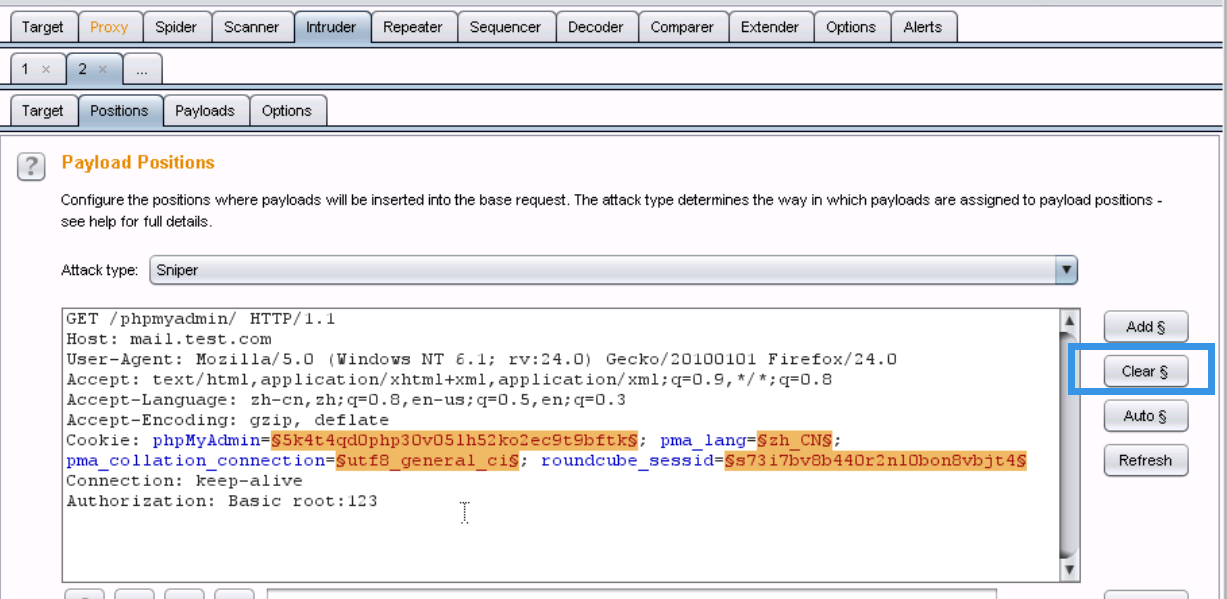 8、右键send to intruder,在Positions选项卡下单击clear$