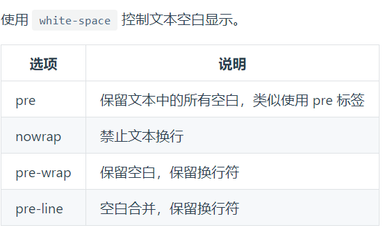 white-space有四个值: 其中空白合并表示多个空白符会合并为一个空格 pre与pre-wrap的区别在于当文字占满一行时,pre不会自动换行,而pre-wrap会自动换行(即使没有换行符)