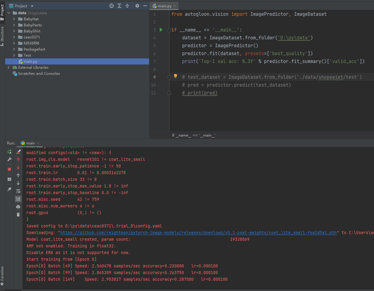 from autogluon.vision import ImagePredictor, ImageDataset if __name__ == '__main__': dataset = ImageDataset.from_folder('D:\py\data') predictor = ImagePredictor() predictor.fit(dataset, presets=['best_quality']) print('Top-1 val acc: %.3f' % predictor.fit_summary()['valid_acc']) # test_dataset = ImageDataset.from_folder('./data/shopeeiet/test') # pred = predictor.predict(test_dataset) # print(pred)