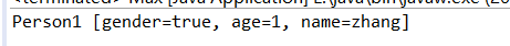 class Person { int age; String name ; Person(int age, String name){ this.age = age; this.name = name; } } class Person1 extends Person{ private boolean gender; Person1(int age, String name , boolean gender) { super(age, name); this.gender = gender; } @Override public String toString() { return "Person1 [gender=" + gender + ", age=" + age + ", name=" + name + "]"; } } public class Main { public static void main(String[] args) { Person1 s = new Person1(1 , "zhang" , true); System.out.println(s); } }