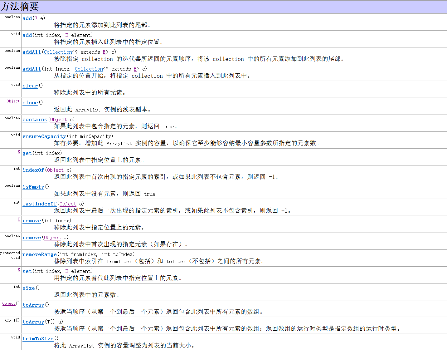 ArrayList的方法: