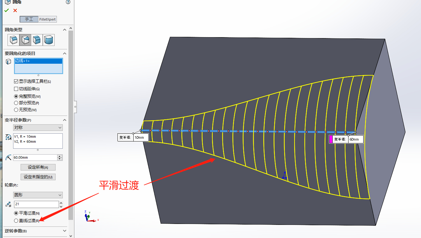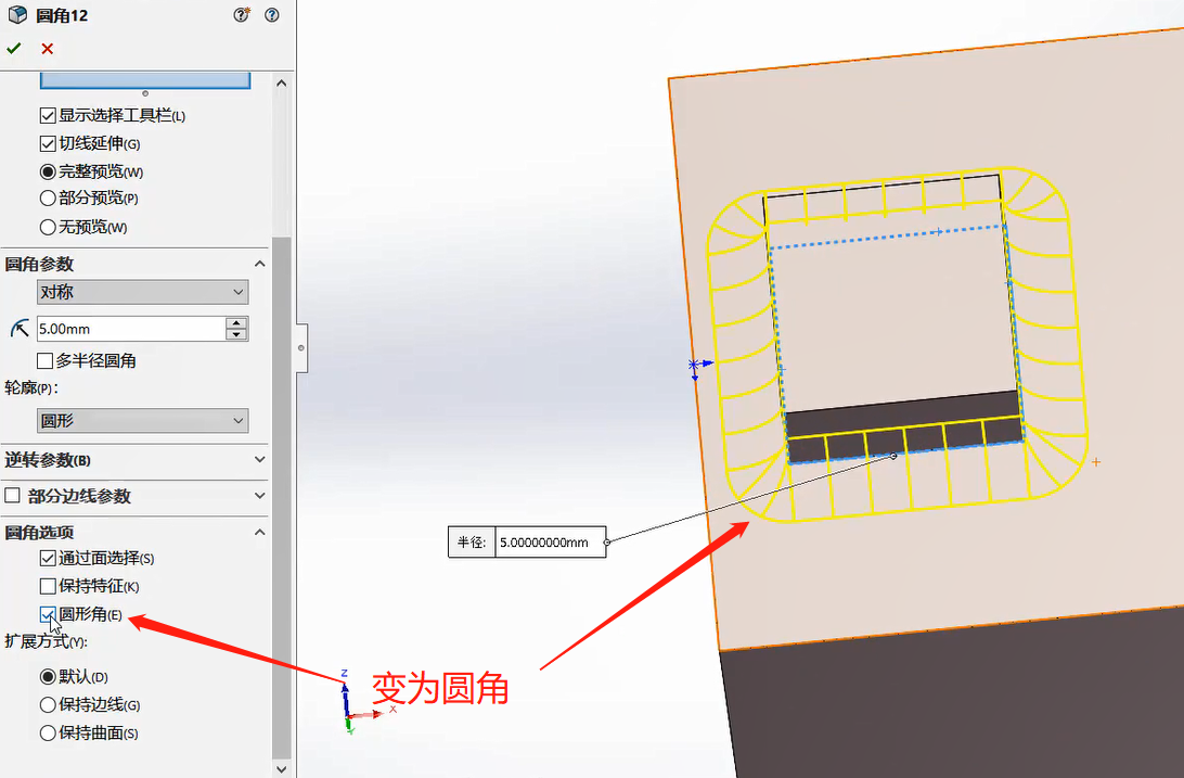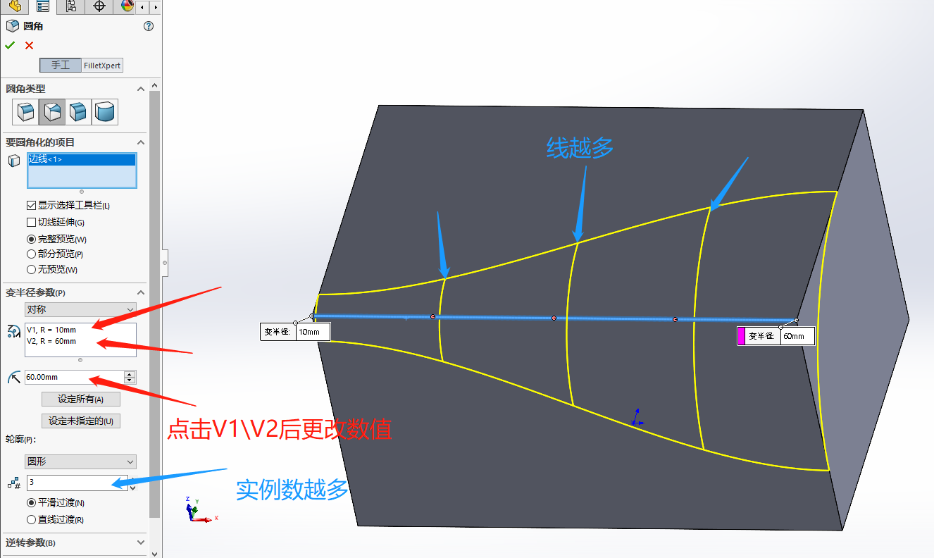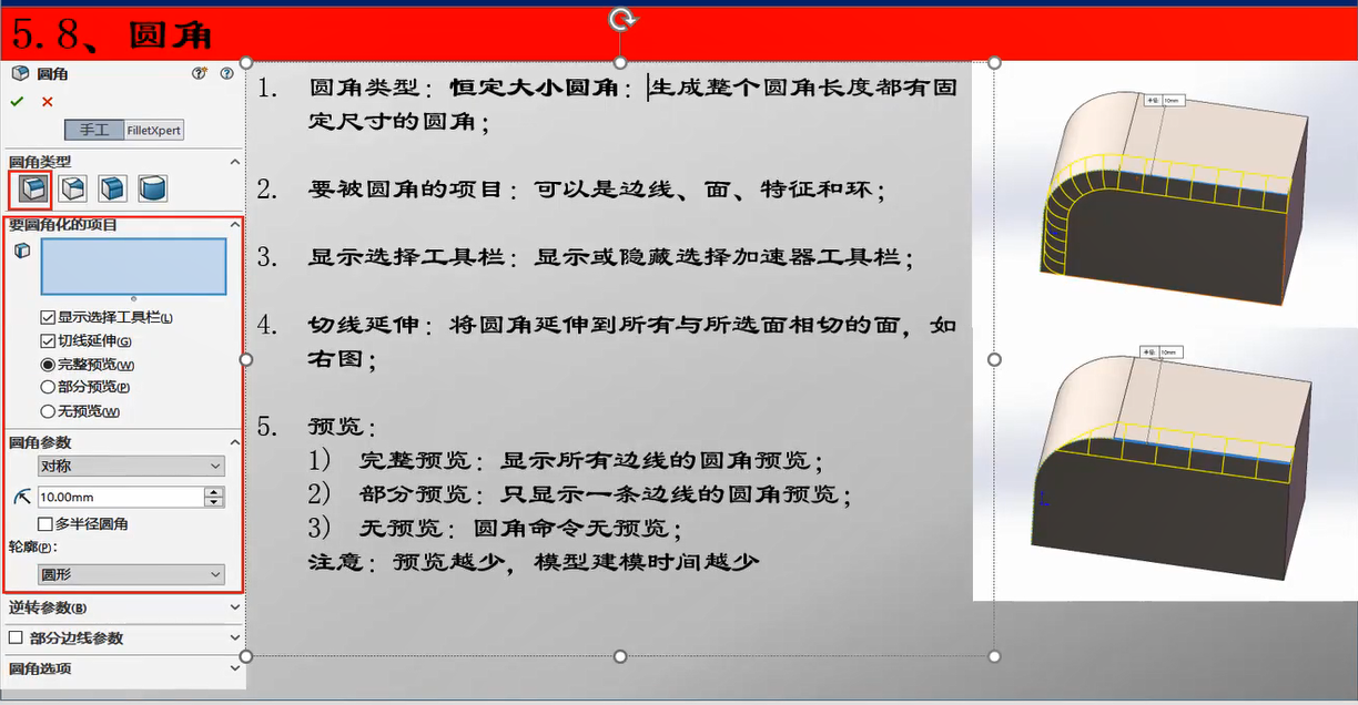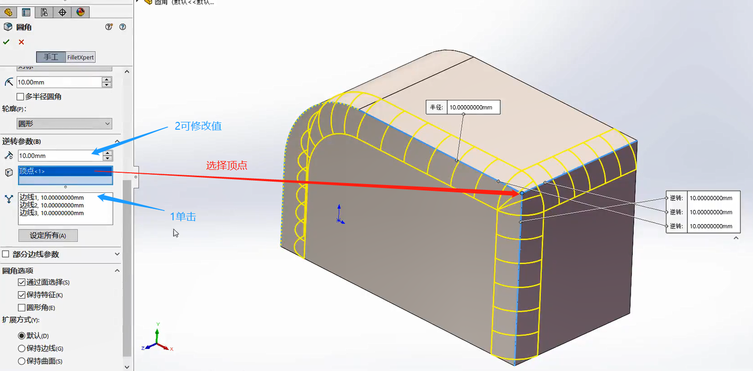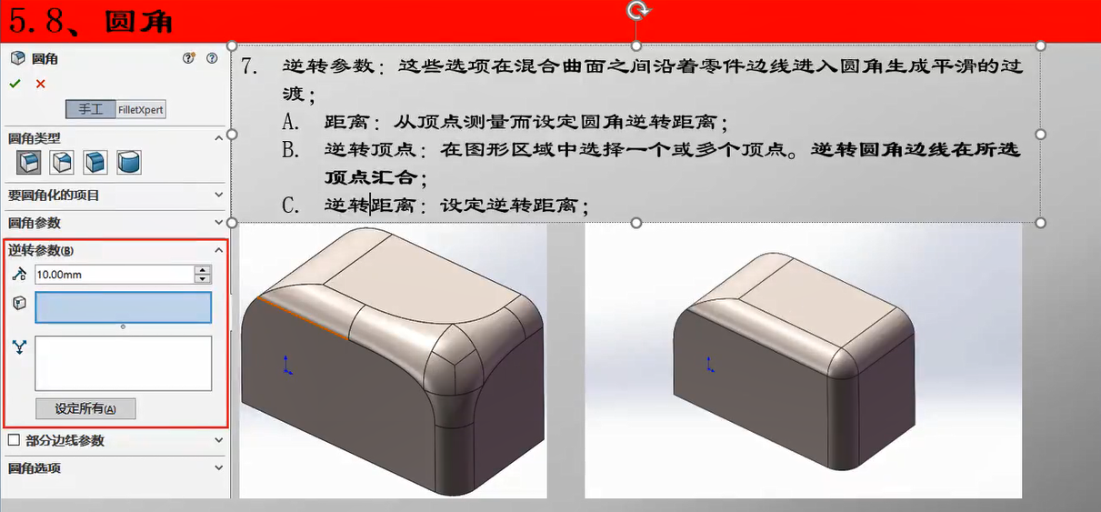 4.部分边线参数:这些选项将沿模型边线创建具有指定长度的部分圆角: